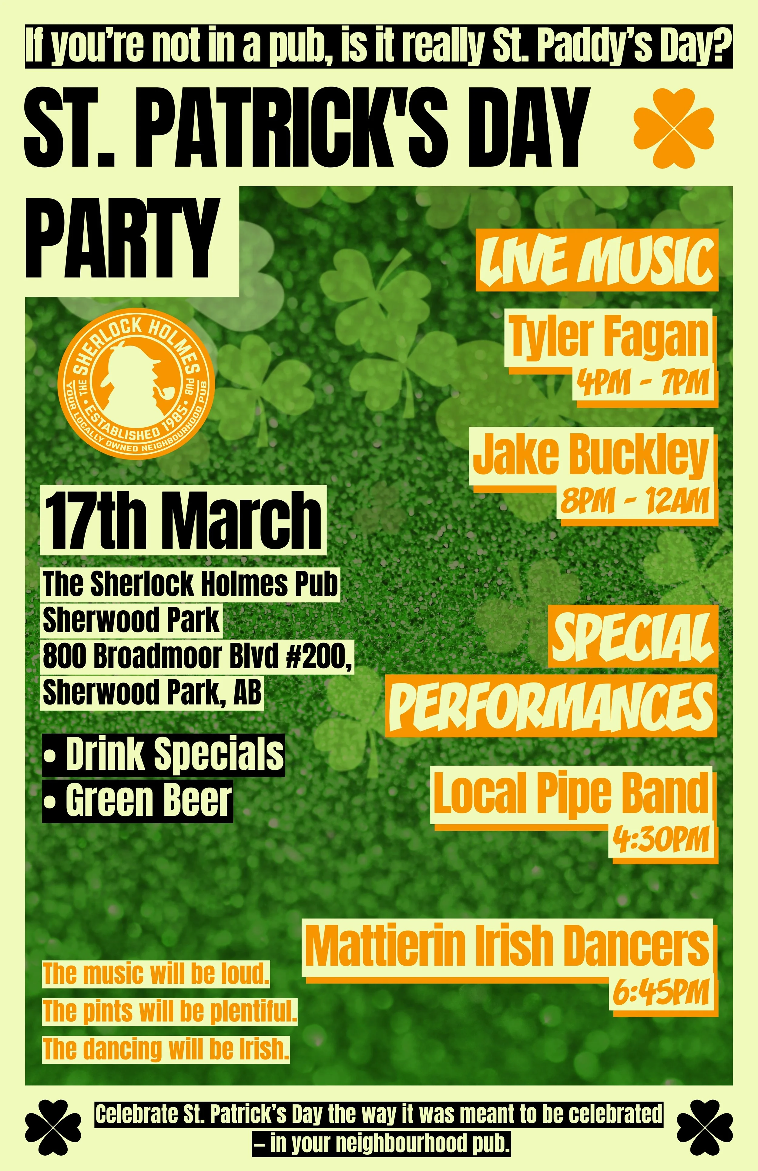 Enjoy festive drink specials, pints of green beer, and the lively spirit of Ireland right here in your neighbourhood pub. We’ll have live music throughout the day, Irish dancers, and a pipe band performance to keep the party going from first pour to last call.